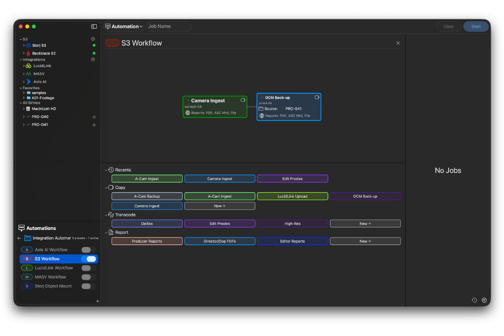 A typical setup might start with verified offloads to a fast SSD. This ensures that camera media is safely copied and ready for any additional steps like proxy transcodes or cloud uploads. The same workflow can also include simultaneous verified backups to slower external drives for redundancy. Each of these stages happens automatically, triggered by the availability of resources rather than manual intervention.